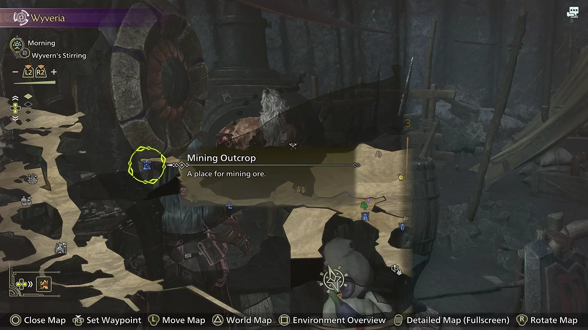 Load into the location and place a marker on one of the mining points. The nearest one is right behind the camp and to the left. The mount should automatically take you to the deposits.