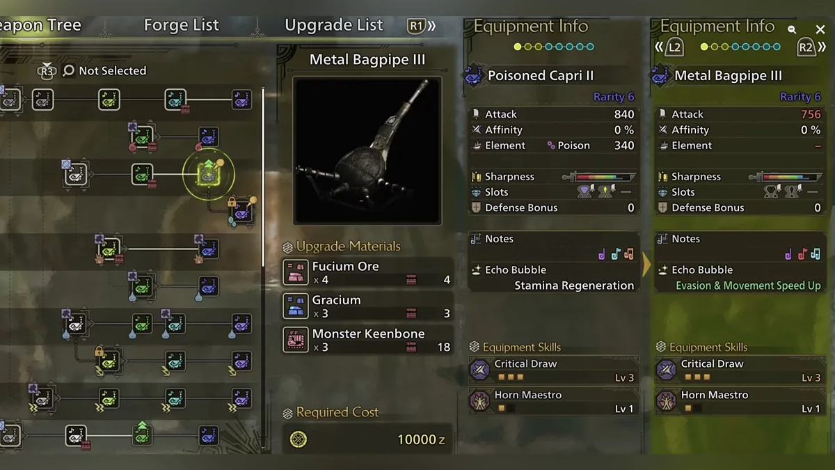 Similarly, you may need Fucium for upgrading certain types of weapons. The fact is that the entire arsenal is upgraded in a tree-like manner, meaning you cannot unlock the best variation until you have made all the previous versions. Even if you do not intend to use a specific barrel or sharpening, you will have to craft it. For example, you need to use Fucium Ore to create the "Metal Bagpipe 3" if you ultimately want to create the "Jin Dhaang Hunting Horn 1". Other types of weapons have similar upgrade chains requiring Fucium Ore.