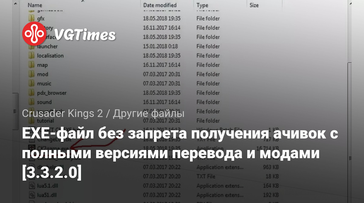 Замените CK2game.exe в корневой папке игры (например, "..\Steam\steamapps\common\Crusader Kings II\), чтобы без использования сторонних утилит всегда иметь возможность получать достижения с модами и любыми версиями перевода.