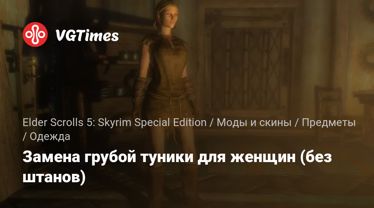 Просто заменяет грубую тунику для женских персонажей версией без штанов (в основном превращает ее в тунику в римском стиле). Мод предназначен для оригинального женского тела, он не поддерживает UNP, UUNP или CBBE. Я хотел, чтобы это было дружественным к истории и выглядело как что-то, что могло бы быть в базовой игре, поэтому я подумал, что лучше всего адаптировать его к оригинальному телу. Он должен работать для женщин всех рас и весов. Не требует ничего, кроме базовой игры.