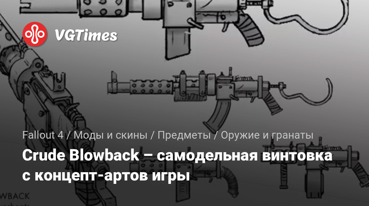 Мод добавляет оружие Crude Blowback – самодельную домашнюю винтовку, основанную на концепт-артах разработчиков игры. Его можно получить через консоль: player.additem 0F001748. Его также можно найти на врагах. Возможно, вам придется ждать/спать 24 часа, чтобы обновить "списки лута". Так же пистолет помещен на причале резервуара Честнат-Хиллок, лежащий на вершине старой ловушки для крабов.