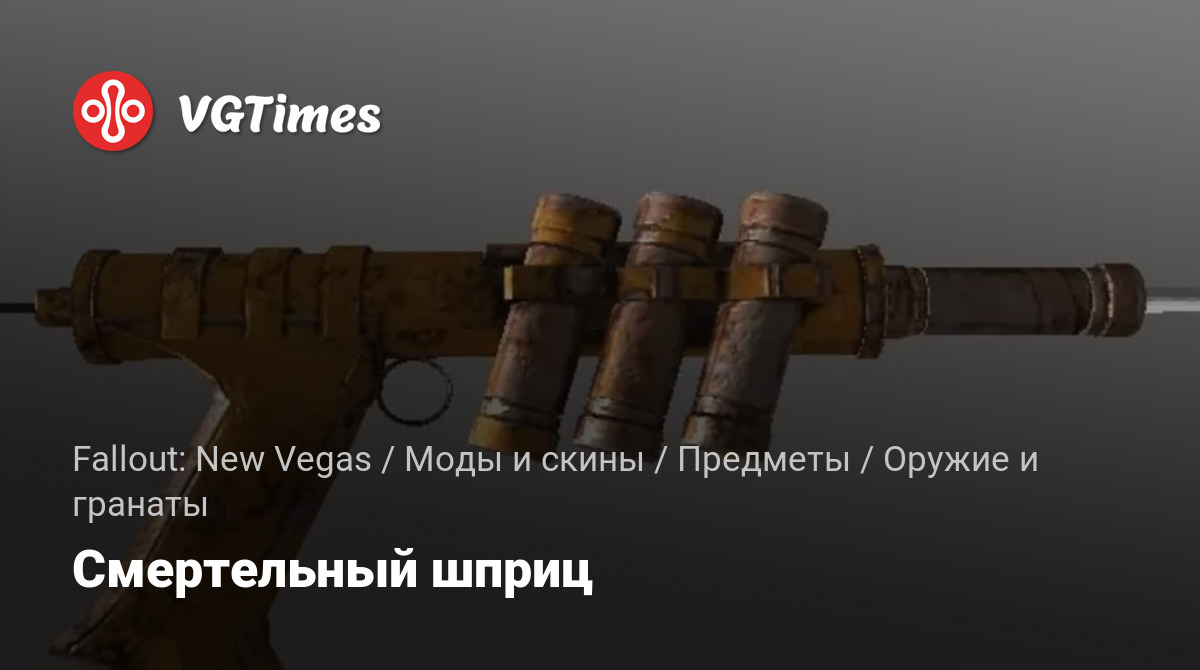 Этот мод добавляет шприц в качестве оружия, его можно купить или украсть в медицинской клинике Нью-Вегаса. Из него можно стрелять ампулами с ядом, которые парализуют противника на 20 секунд. Ампулы можно купить у врачей.