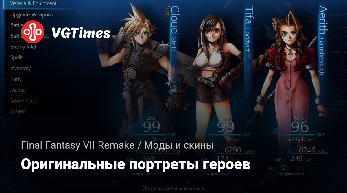 Замените новые портреты на оригинальные, созданные Тэцуей Номурой! Включает только Клода, Баррета, Тифу и Айрис. Для установки распакуйте скачанный архив по этому пути FFVIIRemakeIntergrade/End/Content/Paks/mods.