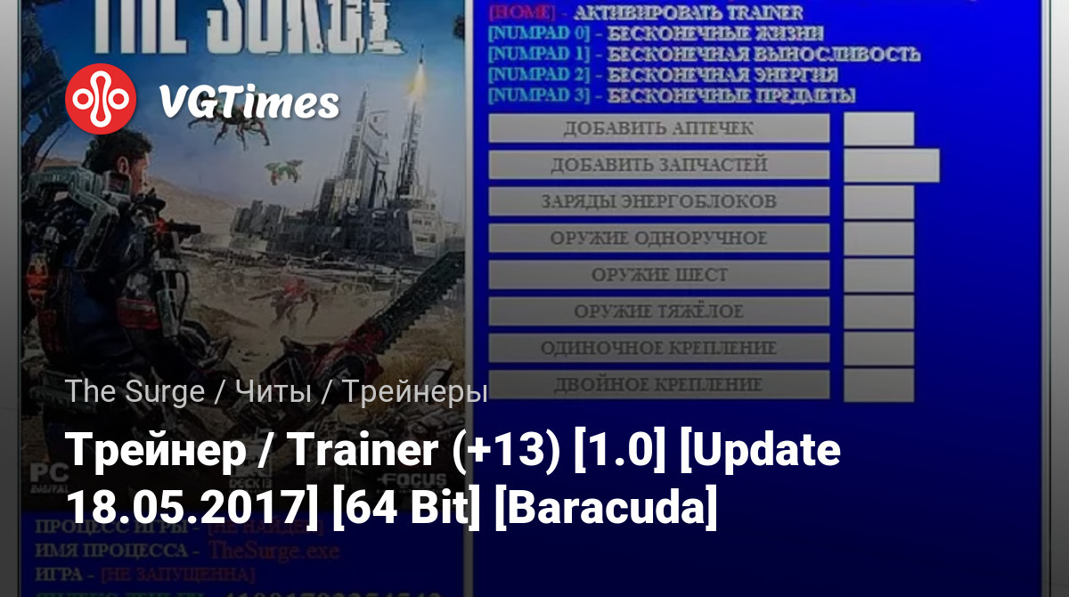 у кого [Trainer] не работает, убедитесь что файл запуска игры, который лежит в главном каталоге установленной игры, называется TheSurge если нет то переименуйте его на TheSurge