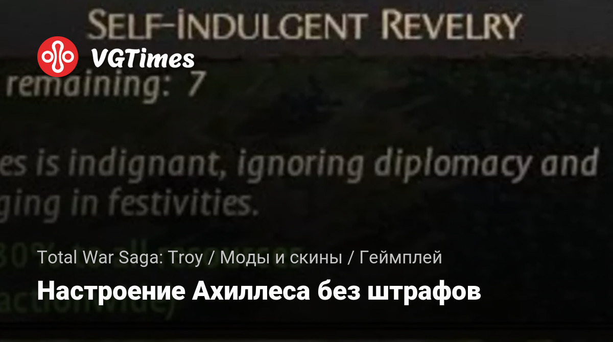Этот мод удаляет все штрафы, связанные с настроением Ахиллеса. Распакуйте архив .zip и переместите файл .pack в папку данных. Например, в «C: / Epic Games / TotalWarSagaTROY / data».