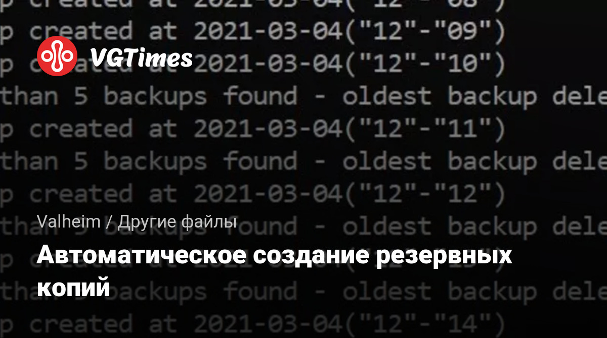 Создает резервную копию всей папки сохранения Valheim, включая Character, World и т. д.Расположение резервной копии по умолчанию — C: / users / / AppData / LocalLow / IronGate / valheim_backup. По умолчанию хранятся только 5 новейших резервных копий, остальные удаляются. По умолчанию время между резервными копиями составляет 30 минут, потому что автосохранение игры происходит каждые 30 минут.
