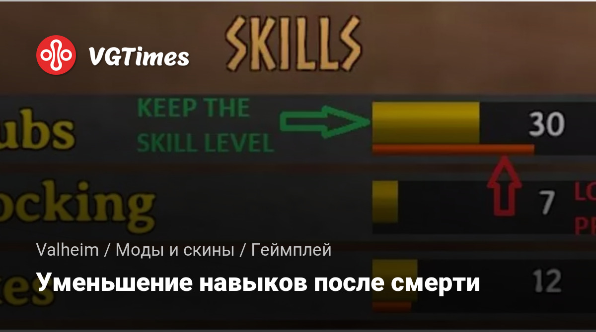 Этот мод реализует потерю 5 процентов навыков после смерти. Вы потеряете прогресс к следующему уровню навыков (красная полоса под каждым навыком).