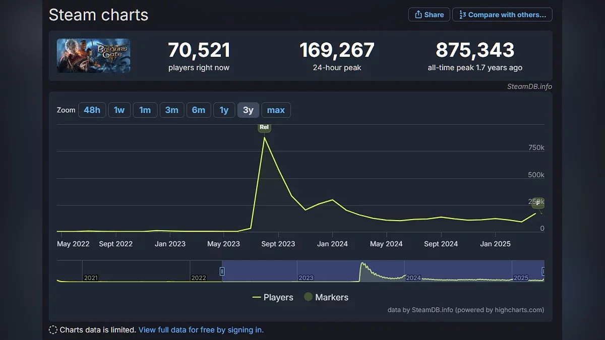 如预期, Baldur’s Gate 3的最终补丁为这款奇幻角色扮演游戏在Steam上带来了重大提升。根据SteamDB的数据,周末时同时在线玩家人数达到了169,000人——这是自2024年2月以来的最高记录。