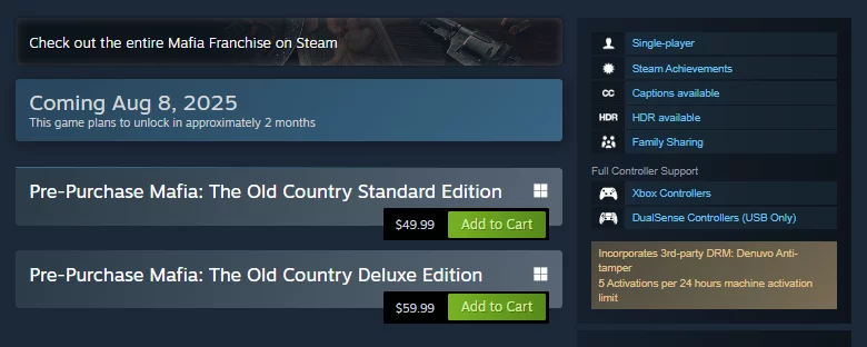 黑手党:旧国,由Hangar 13开发的即将推出的第三人称射击游戏,将在PC上采用Denuvo反盗版保护。这一信息已通过 游戏的Steam页面正式确认。