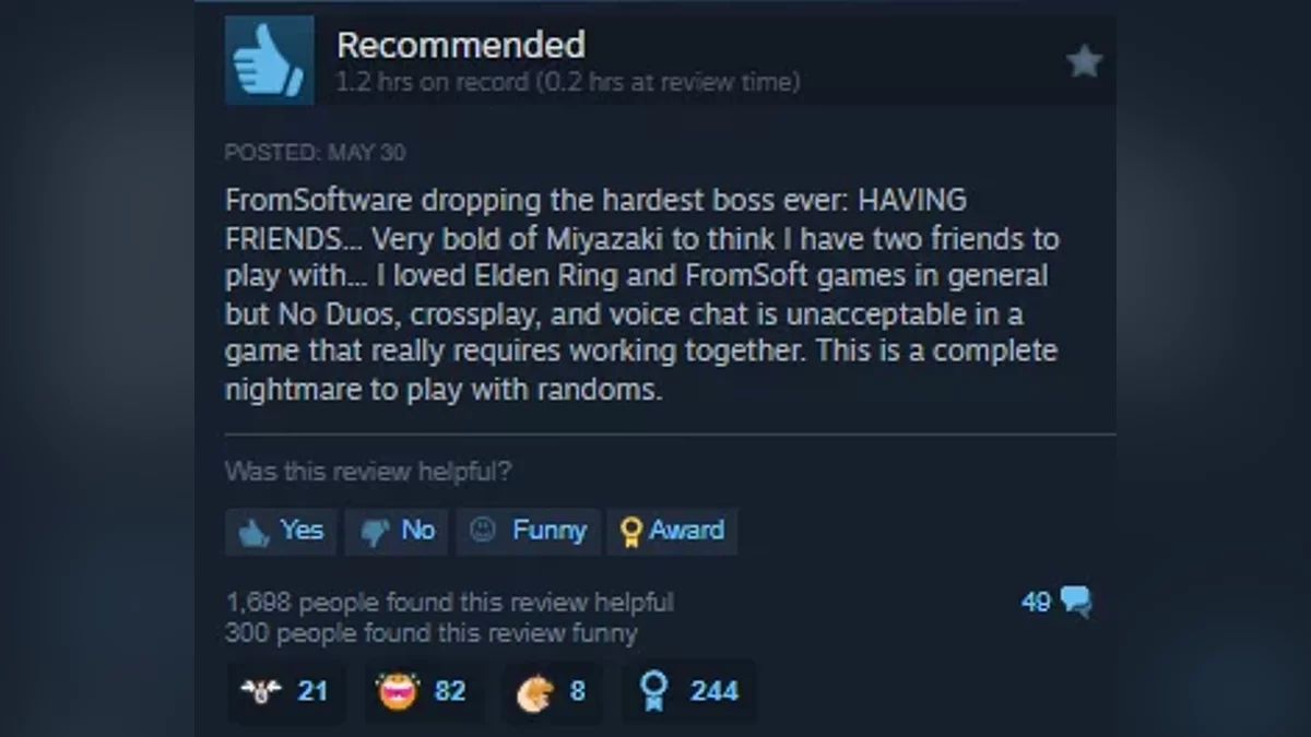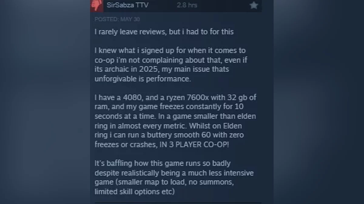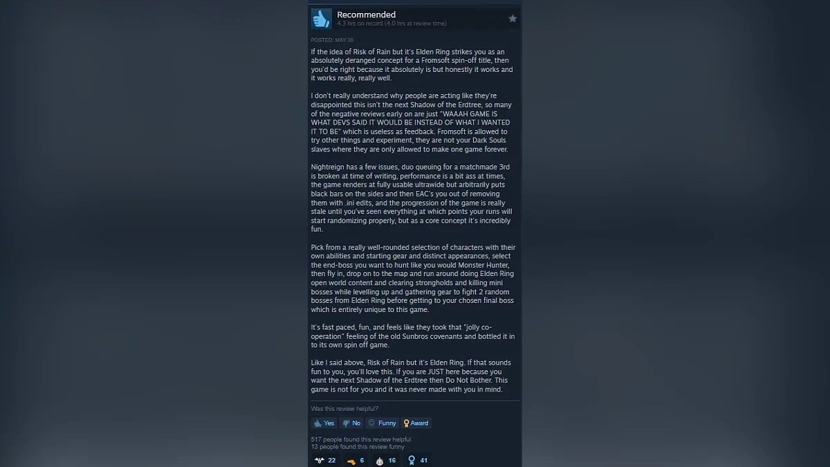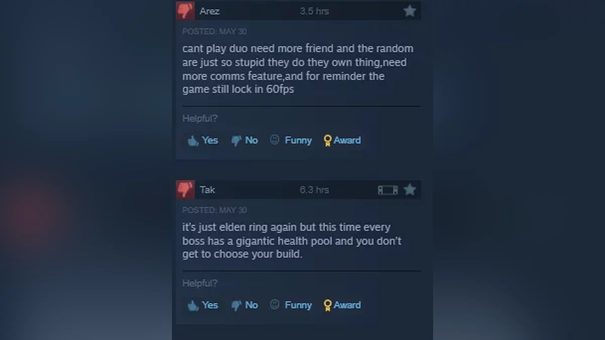 截至撰写时,该游戏的评分为67%,评价为“混合”。常见的投诉包括角色的耐力有限、合作机制笨拙、匹配时间过长、键盘控制令人沮丧、即使在高端GPU上也存在性能问题,以及一些人所描述的糟糕游戏设计,过度重复使用之前FromSoftware作品的资产。