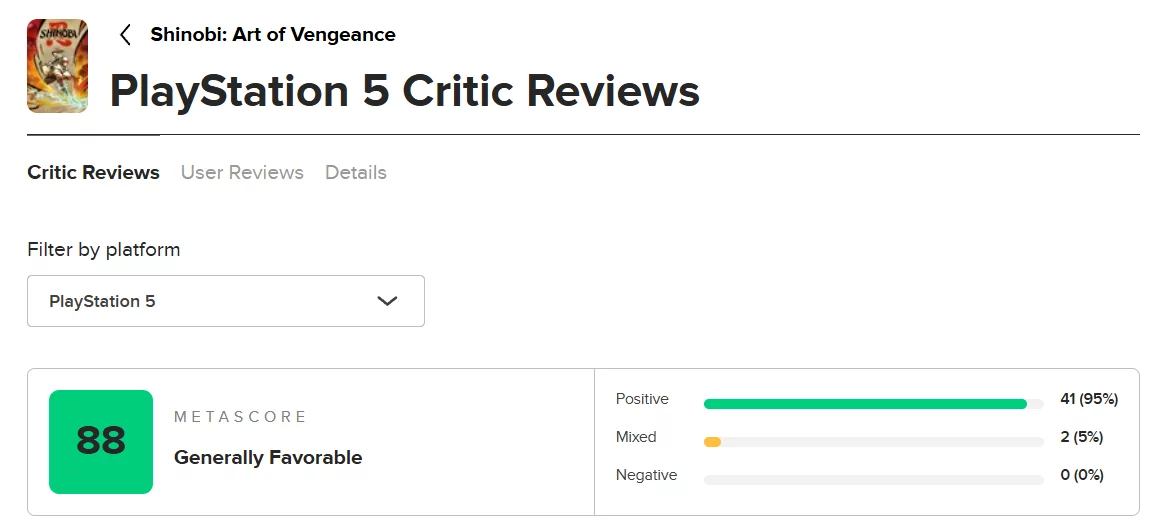 忍者:复仇之艺术,由SEGA和Lizardcube( 愤怒的街道4背后的团队)共同开发的新动作平台游戏,在 Metacritic上收到了首批评价。该游戏获得了广泛的好评,平均得分为88。