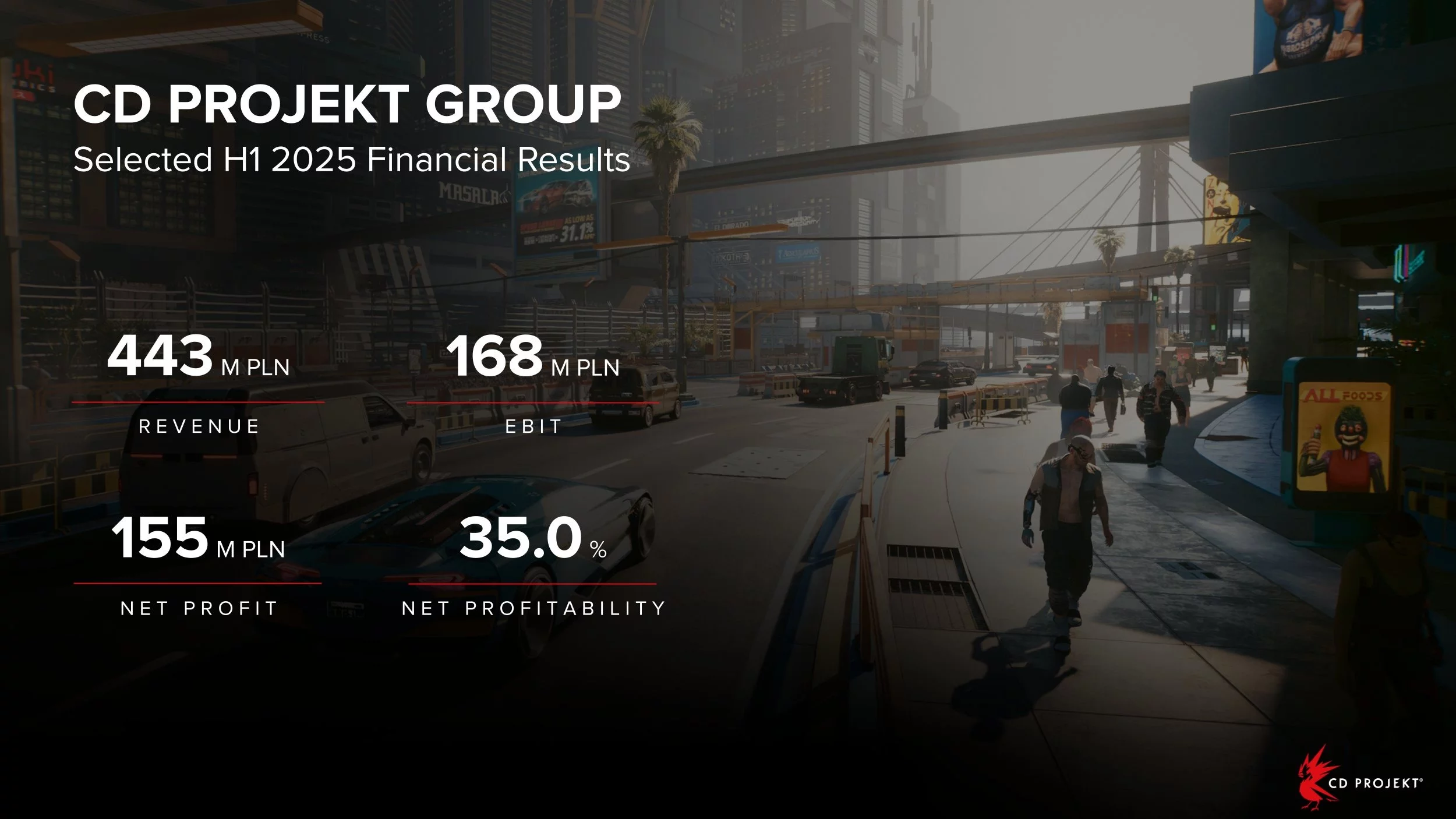 CD Projekt分享了关于工作室当前运营的新统计数据。在2025年上半年,该公司报告收入为4.43亿波兰兹罗提(约合1.21亿美元),营业利润(EBIT)为1.68亿波兰兹罗提(约合4600万美元),净利润为1.55亿波兰兹罗提(大约4200万美元)。净盈利能力为35%。