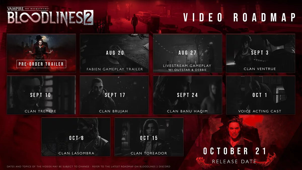 在接下来的六周内,工作室将发布其他家族的预告片:Tremere(9月10日)、Brujah(9月17日)、Banu Haqim(9月24日)、Lasombra(10月2日)和 Toreador(10月15日)。