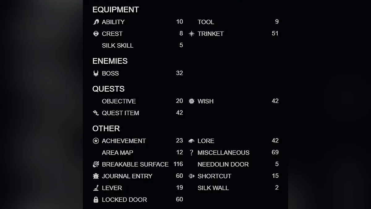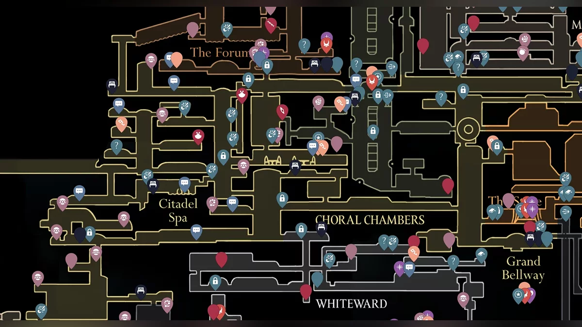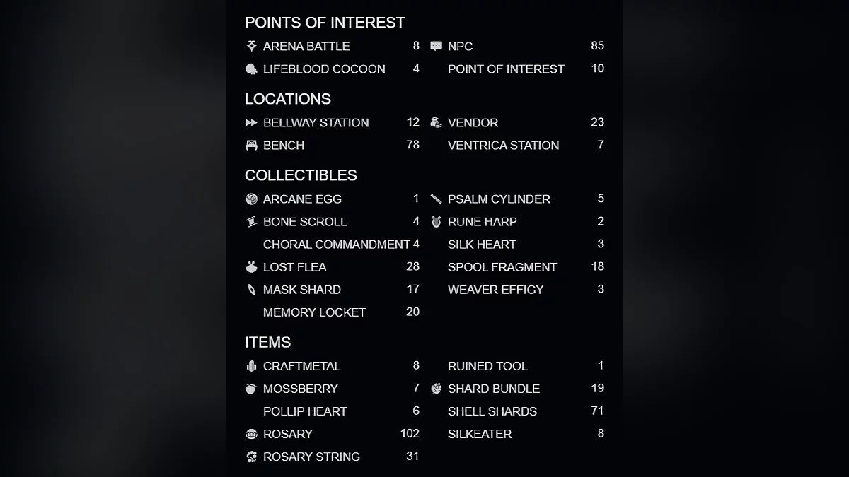 地图标记了NPC、商人、首领、长椅、钟楼站(用于快速旅行)、消耗品,包括念珠线、念珠和苔莓、装备,以及各种收藏品,如失落的跳蚤、面具碎片、记忆锁链、丝心、线轴碎片、骨卷轴等。