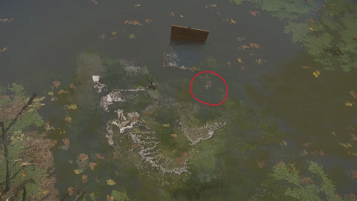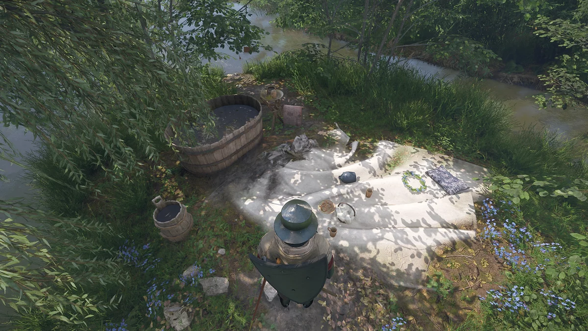 Approach the river and move along the left bank until you find a clearing with blue flowers and a tree next to which lie three mattresses.
