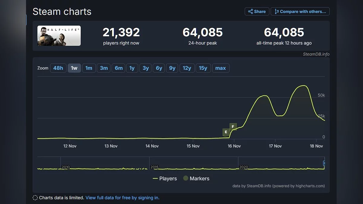 According to SteamDB, Half-Life 2's player base surpassed 50,000 concurrent players over the weekend. On November 16, the peak number of players reached 52,000, and on November 17, it climbed to a record-breaking 64,000. At the time of writing, Half-Life 2 still remains among the top trending games on the platform.