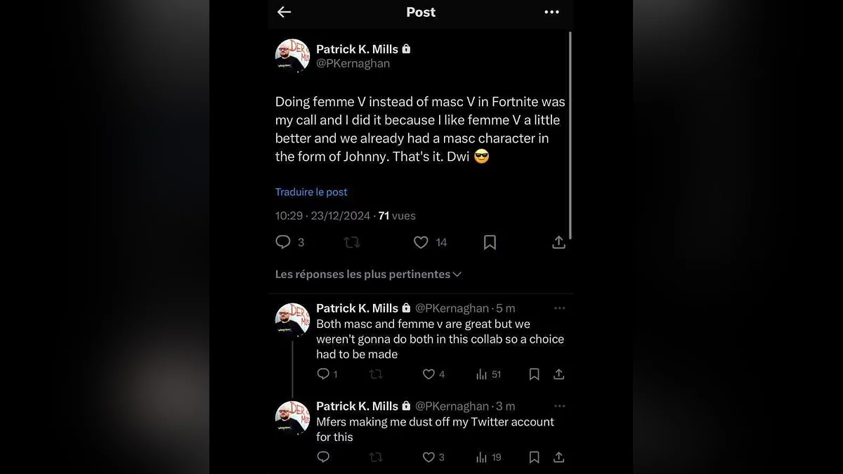 最近, Fortnite 推出了 皮肤 ,包括约翰尼·银手和女性版本的V。然而,一些玩家希望看到男主角的版本。 Cyberpunk 2077的高级设计师帕特里克·K·米尔斯最近解释了为什么男V没有被包含在游戏中。