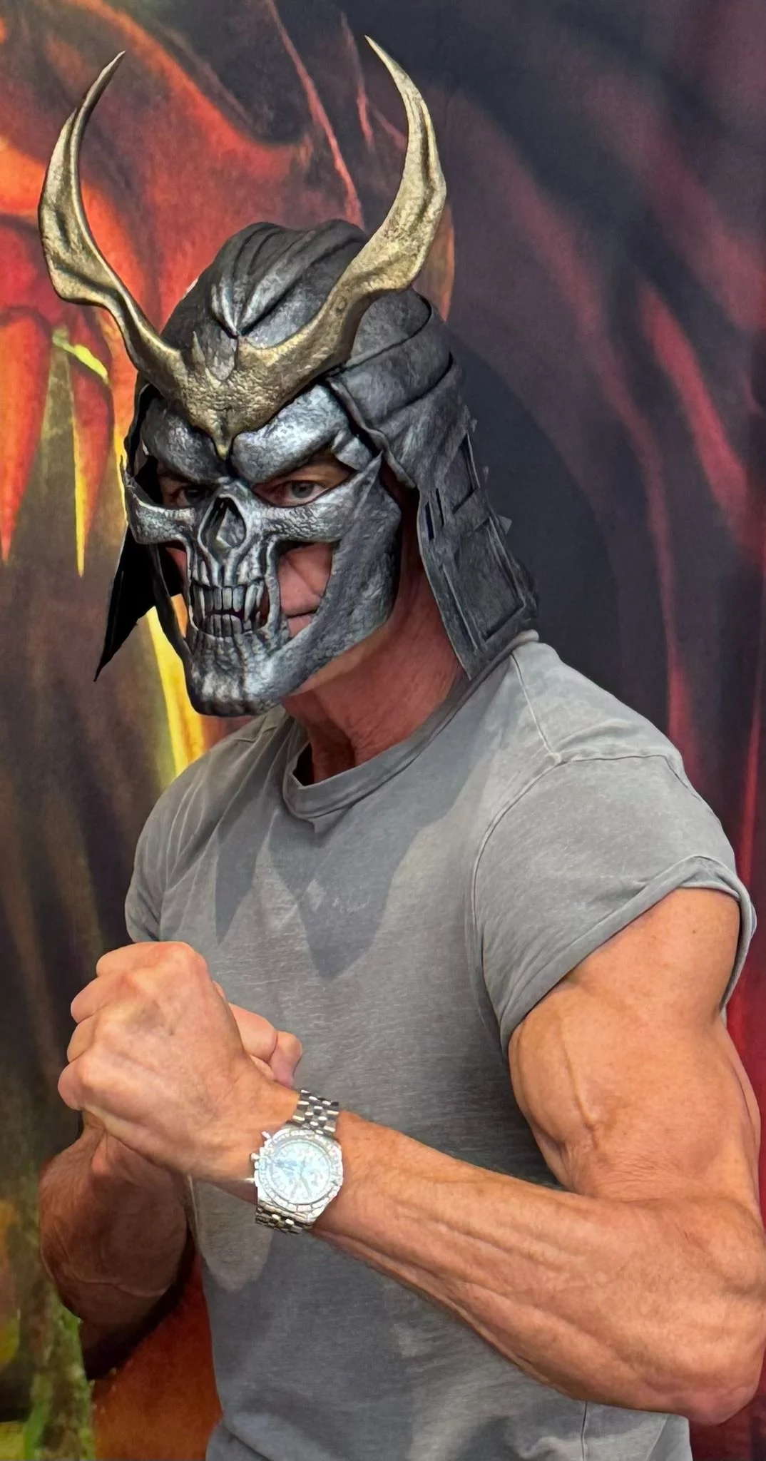 演员和健美运动员布莱恩·格林,因在 《真人快打 2} 和 《真人快打 3}中饰演沙欧·卡恩而闻名,最近在复古城市游戏节活动中 试戴了他角色的新头盔 ,该电影即将上映。