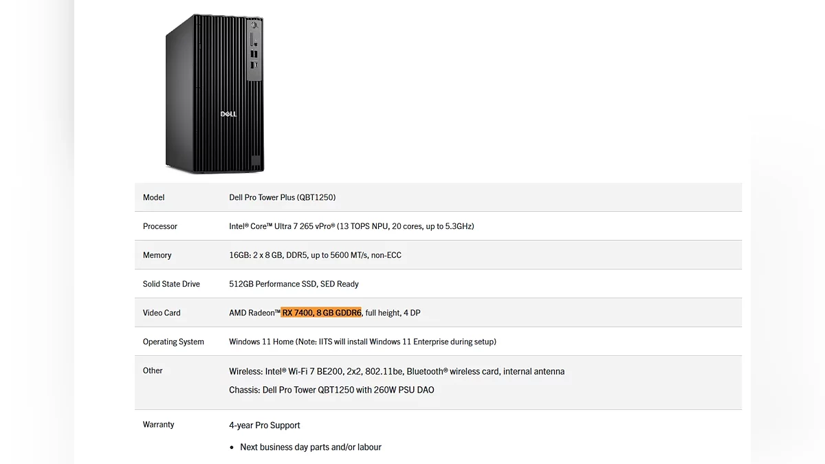 AMD的新入门级显卡Radeon RX 7400意外地在戴尔桌面系统中出现并开始销售。戴尔在其Pro Tower Plus QBT1250 PC的配置中包含了这款尚未正式发布的GPU。