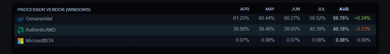 英特尔的处理器市场份额在八月略微增加了 0.24%,目前 59.76% 的 Steam 用户正在使用英特尔 CPU。相比之下,AMD 的市场份额为 40.16%。