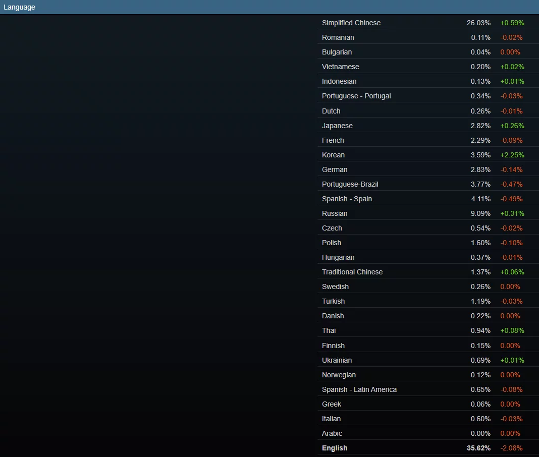 至于语言偏好,英语(35.62%)、简体中文(26.03%)和俄语(9.09%)仍然是 Steam 上最受欢迎的三种语言。