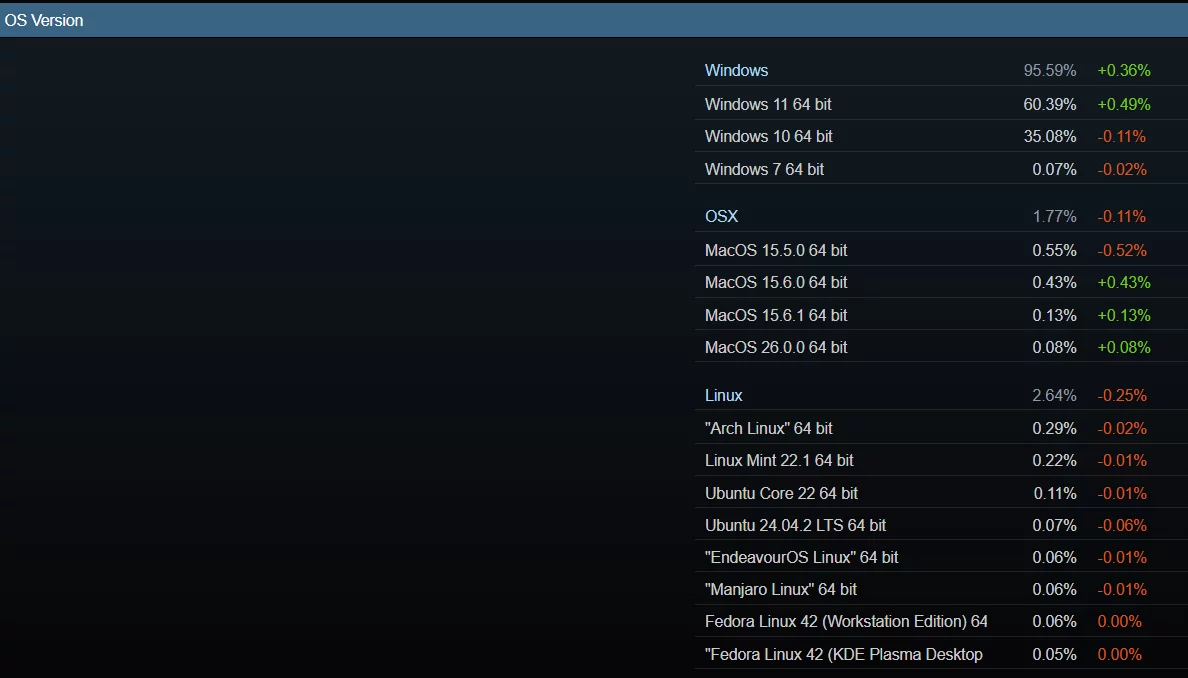 Windows 11 64 位继续增长,上升了 0.49%,总用户达到 60.39%。与此同时,Windows 10 64 位仍然被 35.08% 的 Steam 玩家使用。