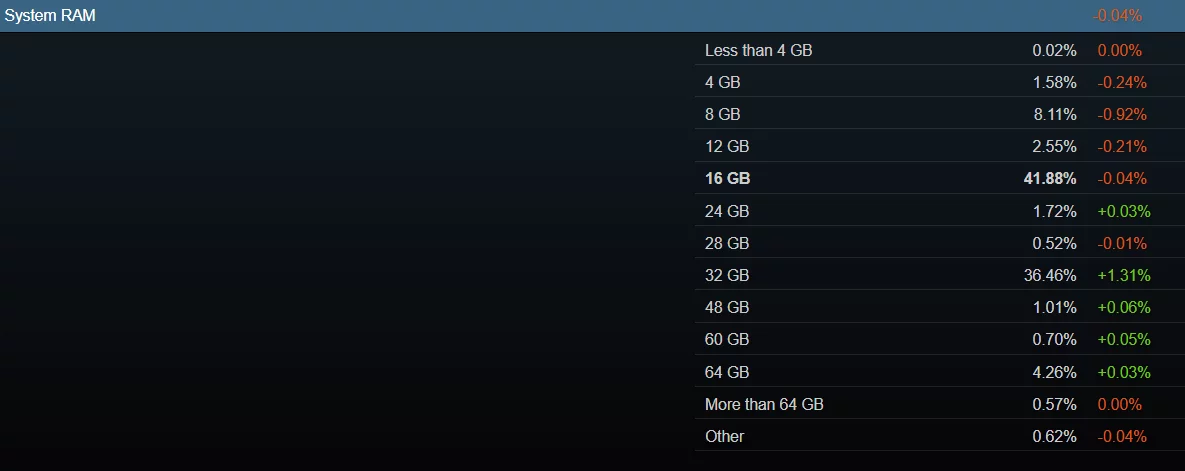 在内存方面,16 GB 仍然是大多数玩家的最佳选择,41.88% 的用户配备了这个容量。36.46% 的系统安装了 32 GB 的内存。