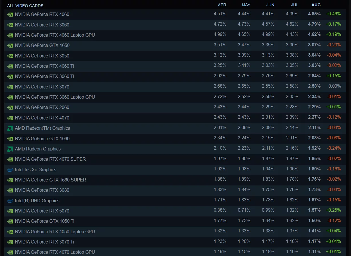 在八月,NVIDIA GeForce RTX 4060 成为最受欢迎的显卡,占用户的 4.85%。紧随其后的是 RTX 3060(4.79%)、RTX 4060 的笔记本版本(4.62%)、GTX 1650(3.07%)和 RTX 3050(3.04%)。
